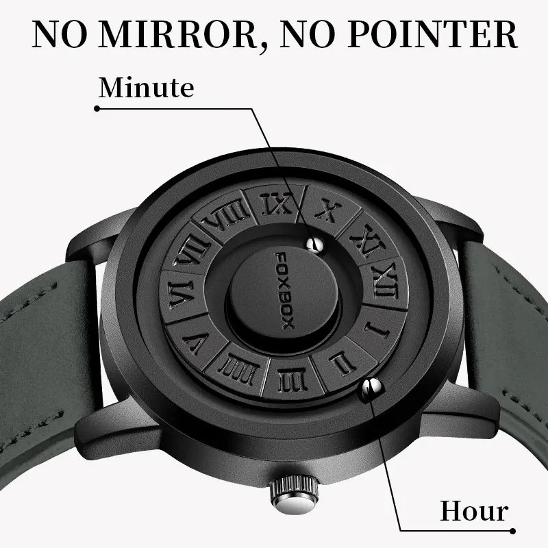 FOXBOX-Men's Magnetic Quartz Wristwatch Creative Scroll Pointer Genuine Leather Watch