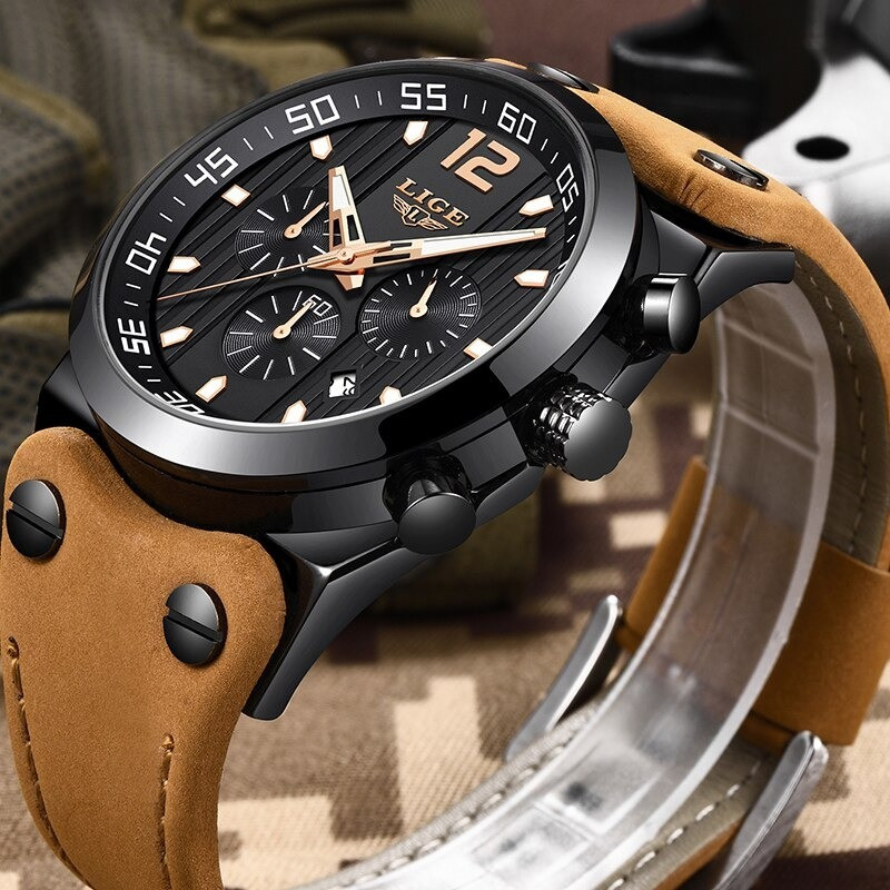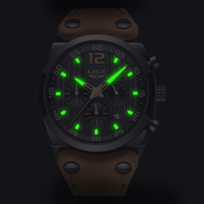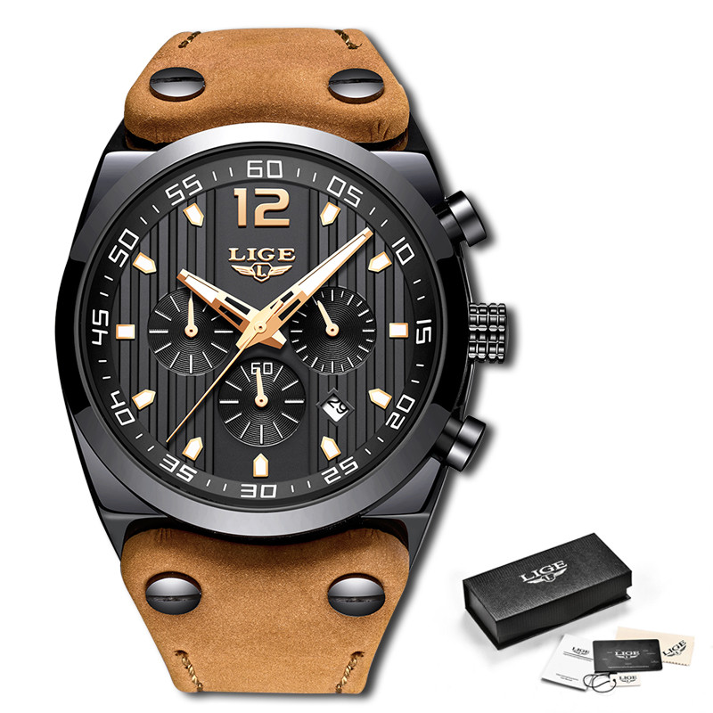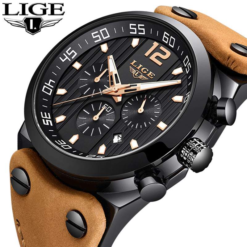 LIGE 9890 Luxury Chronograph Leather Waterproof Sport Watch